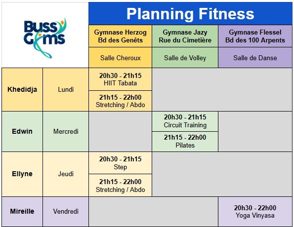 Sauf contre-indication, toutes les séances ont lieu au Gymnase Herzog – Boulevard des Genêts